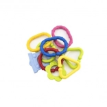 Ez a színes műanyag formakészlet ideális első játék babáknak. Az elemek könnyen összepattinthatók és stabilan tartanak, így a gyerekek újra és újra készíthetnek láncokat és egyszerű szerkezeteket. A különböző textúrák és színek gazdag érzékszervi ingereket nyújtanak, a csörgő hatás pedig leköti és megnyugtatja a kicsiket.