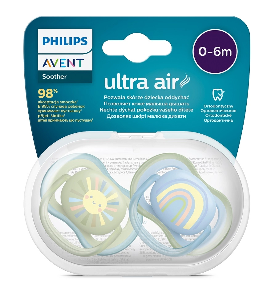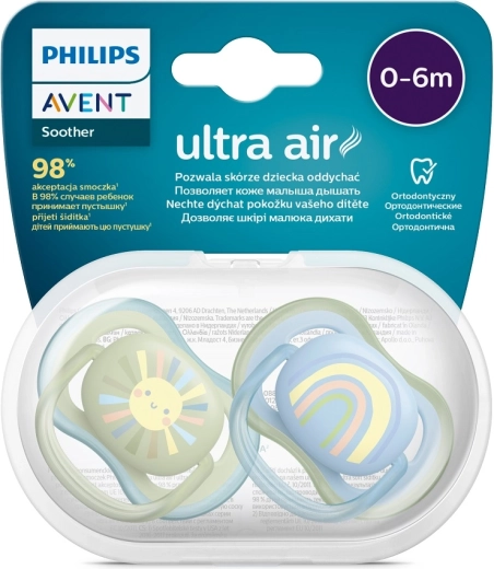 Nyugtassa meg babáját a Philips Avent Ultra Air cumikkal, amelyek rendkívül nagy szellőzőnyílásokkal rendelkeznek a jobb légáramlásért és a száraz, nyugodt bőrért. A puha, ortodontikus szilikon szívóka támogatja a szájüreg természetes fejlődését, és a texturált felületnek köszönhetően természetes és kényelmes érzetet nyújt. A praktikus utazótok mikrohullámú sterilizáláshoz 3 perc alatt könnyű higiéniát biztosít otthon és útközben is.
