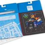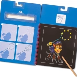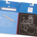 A készlet része egy fa kaparó, sablonok és matricák. A gyerekek átrajzolhatják a formákat, kiegészíthetik a jeleneteket, és fejleszthetik finommotorikájukat.