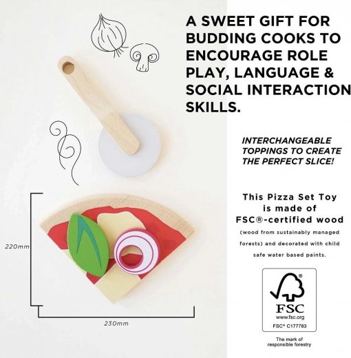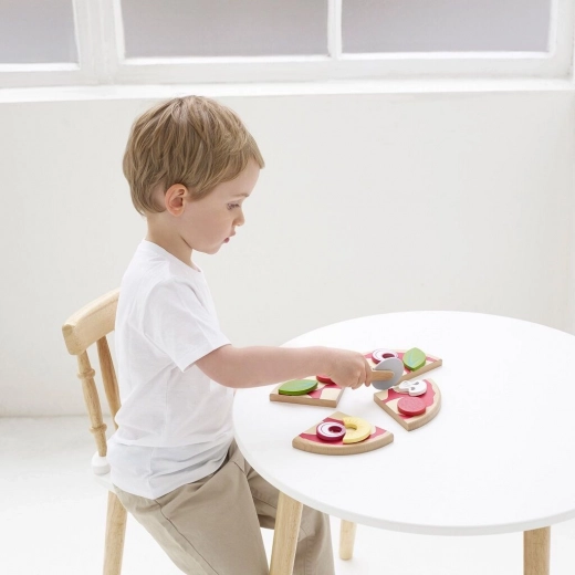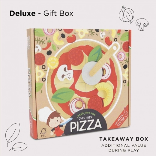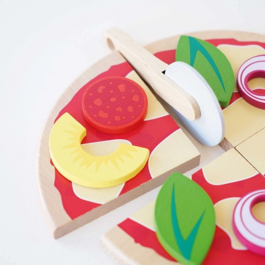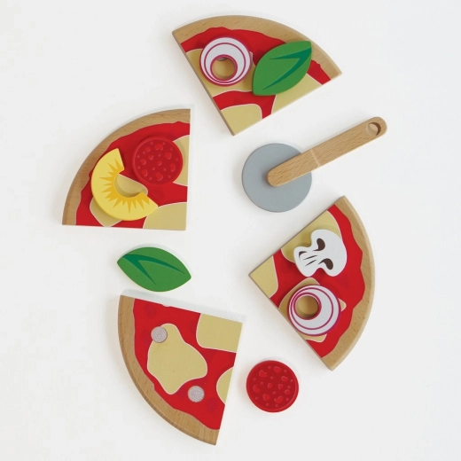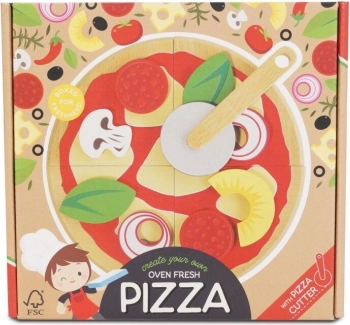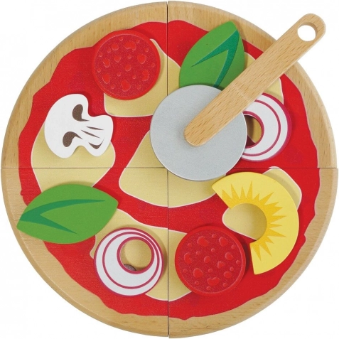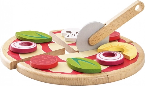 A gyerekeknek készült fából készült pizza minden kis szakács kedvence lesz. A négy szelet a mellékelt körkéses vágóval „szeletelhető”, a feltétek – például szalámi, gomba, hagyma, bazsalikom vagy ananász – tetszés szerint kombinálhatók. A valósághű doboz pizzériás, tálalós és közös játékra hív.