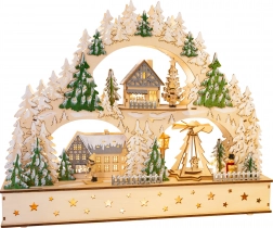 Kézműves hatás, precízen kivágott fák és házikók, valamint a fa természetes árnyalata teszik az ívet a karácsonyi dekoráció figyelemfelkeltő középpontjává az ablakban és a komódon egyaránt.