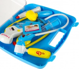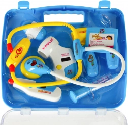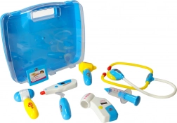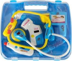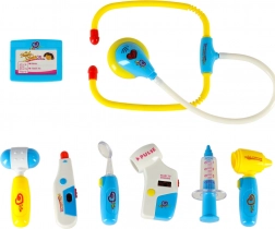 A készlet részei orvosi eszközök, mint a sztetoszkóp, hőmérő, vérnyomásmérő, fülvizsgáló eszköz, fecskendő, kalapács, orvosi jelvény és nyakvizsgáló eszköz világítással.
