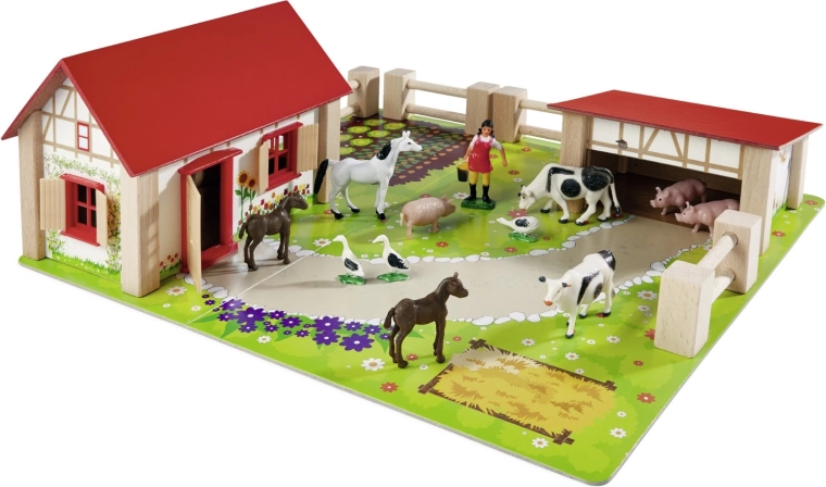 Az EICHHORN fa tanya örömet szerez minden kis gazdának. A szett tartalmaz piros tetős házat, istállót, kerítéseket és részletgazdag állatfigurákat, köztük lovakat, teheneket, malackákat és ludakat. A csomag része egy színes alap is utakkal és kiskerttel, amely könnyen irányt ad a saját jelenetek és történetek kialakításához. A masszív fa szerkezet és a tartós anyagok hosszú élettartamot és biztonságos játékot biztosítanak.