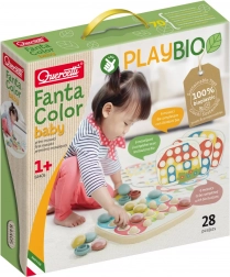 A Quercetti FantaColor Baby mozaik a PlayBio sorozat része, ami azt jelenti, hogy 100%-ban újrahasznosított anyagokból készült, amelyek ökológiailag fenntarthatóak és környezetbarátok. 28 darabot tartalmaz, beleértve a perforált táblát és 21 színes pöcköt, amelyeket könnyen helyére lehet illeszteni. A játékkal való foglalkozás támogatja: