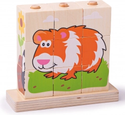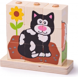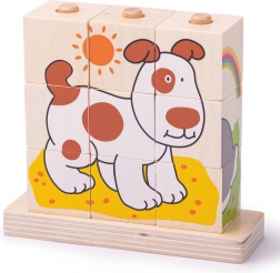 A készlet összesen 10 elemet tartalmaz – 9 kockát, amelyekből 4 különböző kép állítható össze, valamint egy fa alapot pálcikákkal a biztonságos és átlátható építéshez. A játék strapabíró fából készült, sima felülettel, és megfelel a jelenlegi európai biztonsági szabványoknak.