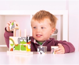 A Bigjigs Baby fa felrakható kockák remek választás első puzzle-ök és kirakók számára. A gyerekek gyakorolják a fogást, az ujjak ügyességét és a vizuális észlelést, miközben megkeresik a kockák megfelelő oldalait és a tüskékre helyezik azokat. A színes állatillusztrációk motiválnak az ismételt játékra, és segítik a koncentrációt.