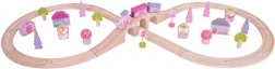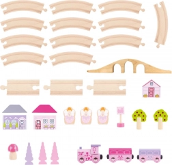 A vasúti készlet mesés díszítésekkel, mint például fák és figurák, lehetővé teszi a gyerekeknek, hogy elmerüljenek a képzelet világában.