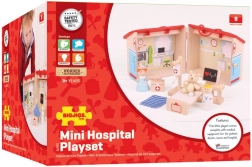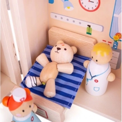 Ez a kompakt és hordozható Mackókórház játékkészlet ideális a kis doktorok számára. A fából készült, tartós szerkezet magas minőségű anyagokból készült, amelyek megfelelnek minden európai biztonsági szabványnak. A játék kilenc elemet tartalmaz, amelyek segítségével a gyerekek különféle jeleneteket és helyzeteket alkothatnak.