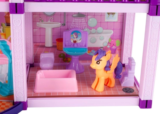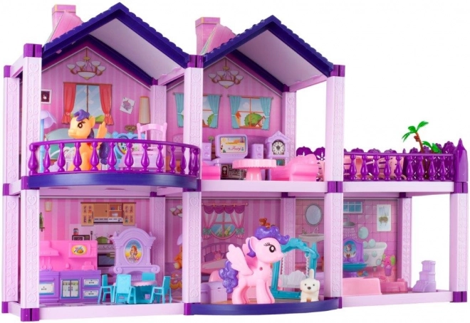 Egyedi, műanyagból készült babaház, amely ideális hosszú órákon át tartó szórakozáshoz minden kislánynak és barátainak. A ház tökéletes a készlet részét képező pónik és kutya, illetve babák számára. Ebben a rezidenciában mindenki úgy érzi magát, mint egy palotában. A nagy házhoz nagyobb bútordarabok is tartoznak, így a játék könnyebb és élethűbb. A belső terek tökéletesen tükrözik az igazi otthon hangulatát.
