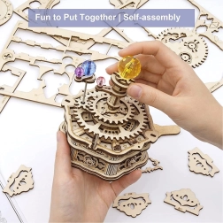 Fedezze fel a Naprendszer mozgó modelljének varázsát: a ROKR 3D fa kirakó Csillagos éj egy elegáns, mechanikus planetárium zenélő dobozzal. A Memory (CATS) dallam lejátszásakor a színes bolygók a „Nap” körül természetesen forognak. A hársfából készült rétegelt lemezből lézerrel kivágott elemek precíz kidolgozást biztosítanak, az építés fejleszti a műszaki gondolkodást, a türelmet és a finommotorikát. Remek oktató és dekoratív kiegészítő a belső térbe, valamint különleges ajándék gyerekeknek és felnőtteknek egyaránt.