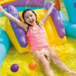A vidám Intex Dinoland vízi játszótér nyári szórakozással tölti meg a kertet. A gyerekek lecsúszhatnak a felfújható csúszdán a pancsolóba, lehűthetik magukat a vízi szökőkút alatt, és játszhatnak a felfújható dínóval, amelyen bedobó kosár is található. A puha landoló alátét növeli a kényelmet és a biztonságot a mókázás közben.