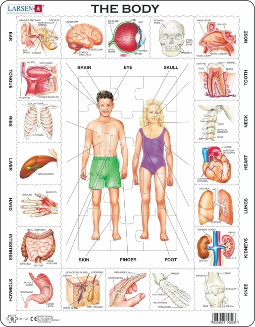 Hozd közelebb a gyerekekhez az emberi test működését a LARSEN oktató puzzle segítségével. Összerakás után szemléletes áttekintést kapnak a szervrendszerekről és a testrészekről, ami támogatja a természetes, játékos tanulást. Minden darab egyedi formájú és csak a saját helyére illik, ami növeli a koncentrációt és a befejezésre ösztönöz.