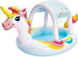 A bájos, egyszarvú alakú felfújható medence órákig tartó nyári szórakozást nyújt a gyerekeknek. A beépített vízpermetezőnek és a színes tetőnek köszönhetően frissít és részleges árnyékot ad. Minőségi vinilből készült, kapacitása akár 130 l, méretei 2,54 × 1,32 × 1,09 m, és 2 éves kortól ajánlott. A csomag tartalmaz javítófoltot is.