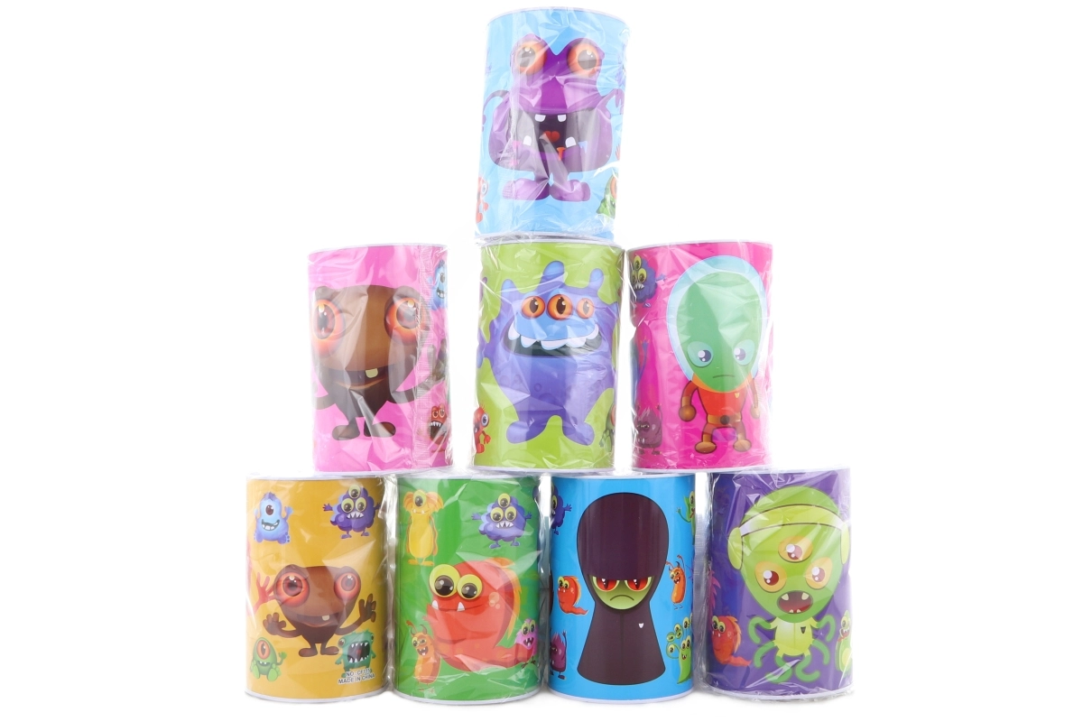 Bádogpersely szörnyecskés mintával, kb. 15 × 10 cm méretben. Tasakban csomagolva. A persely nem nyitható. Ajánlott életkor: 3+
