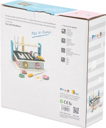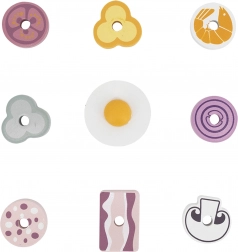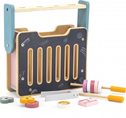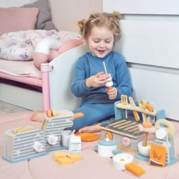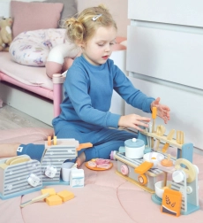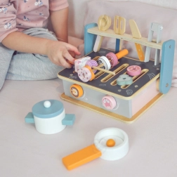 Minden benne van, ami az első receptekhez kell: két fazék és alap konyhai eszközök (kés, kanál, spatula, csipesz), nyársak a saslikhoz, valamint fából készült élelmiszerek, például hús, tojás és zöldség. Színes kivitele játékra csábít, és támogatja a kis szakács szerepjátékát.