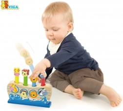 A stabil, bárka alakú fa alap és a négy fa pálcika állatfigurákkal (zsiráf, majom, oroszlán, zebra) biztonságos és tartós játékkörnyezetet teremt. Esztétikus csomagolása ideális ajándékká teszi óvodásoknak és totyogóknak.