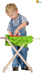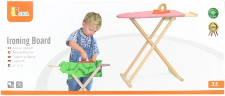 Stílusos és tartós fa vasalódeszka vasalóval a VIGA-tól, 3 éves kortól. Összecsukható kialakítást, erős textil huzatot és praktikus polcot kínál a kiegészítőknek. Kiváló az utánzó játékokhoz és a finommotorika fejlesztéséhez. A deszka mérete kb. 61 × 51 × 30 cm.