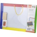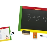 Praktikus kétoldalas, mágneses fa tábla 42 × 30 cm méretben, fekete, krétás és fehér, szárazon törölhető felülettel; a csomagban 4 kréta, egy filctoll és egy szivacs található – ideális 3 éves kortól a kreativitás fejlesztéséhez.