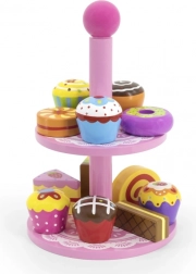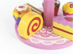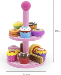 Ez a stílusos, két szintes állványon elhelyezett fa desszertkészlet ideális kávézós, teadélutános vagy „gyerekcukrászdás” szerepjátékhoz. A gondosan kidolgozott, színes fa darabok felfedezésre csábítanak és fejlesztik a szem-kéz koordinációt.