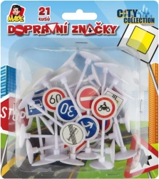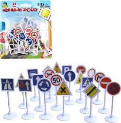 Szórakoztató készlet kis közlekedési táblákból 3 éves kortól. A csomag 21 műanyag táblát tartalmaz a City Collection kollekcióból, nem igényel elemet, és remek a képzelet és készségek fejlesztéséhez. A kompakt méret 18 × 16 × 3 cm megkönnyíti a hordozást és a tárolást.