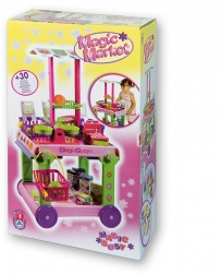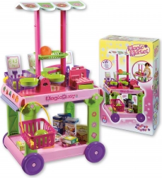 Guruló kocsi levehető napellenzővel, oldalsó kihúzható pult, 4 kosár fogantyúval, pénztárgép érmékkel, mérleg tálkákkal, 12 db gyümölcs és zöldség, 8 dobozos áru