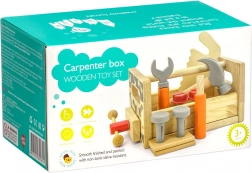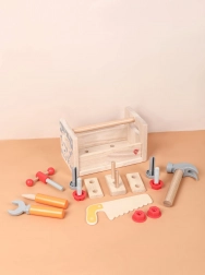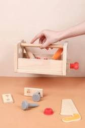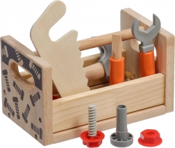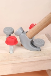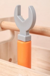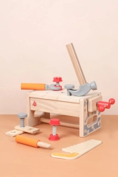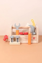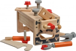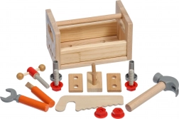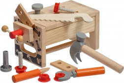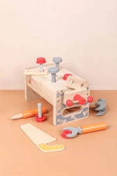 A szett változatos gyerek szerszámokat tartalmaz: kalapács, fűrész, csavarhúzó, kulcs, csavarok és anyák, satu, valamint sima, lyukas fa elemek. Mindennek megvan a helye, így a gyerekek rendet is tanulnak, valamint az alapvető kötőelemekkel végzett munka technikáit. A játék támogatja a kreatív építőjátékot, a kéz–szem koordinációt és a türelmet.