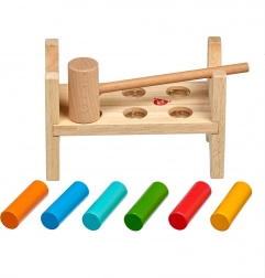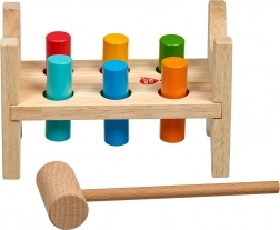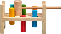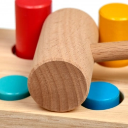 Hat színes szeg és egy fa kalapács tanítja a gyerekeket a pontos fogásra, az ütés erejére és a szem–kéz koordinációra.