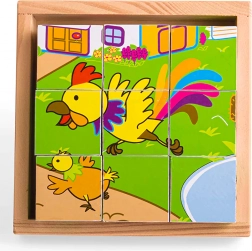 Kilenc masszív fa kocka együtt hat cuki állatos képet alkot. A gyerekek a kockákat forgathatják, kombinálhatják és alkothatnak, ami természetes módon fejleszti a finommotorikát, a kézügyességet és a koncentrációt. A készlethez tartozik egy fa alaplap is a könnyű kirakáshoz és biztonságos tároláshoz – ideális otthonra és útra.