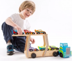 Ez a fa autószállító nagyszerű lehetőséget kínál a szórakoztató és tanulási játékhoz. A gyerekek könnyedén be- és kirakodhatják a járműveket az eltávolítható felső szint segítségével, ami serkenti a képzeletet és a koordinációt. A játék kiváló minőségű fából készült, amely biztosítja a hosszú élettartamot és kellemes tapintási élményt nyújt.