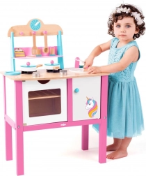 Fedezze fel a WOODY varázslatos, unikornis motívumos konyhácskát, amely kreatív kulináris stúdióvá változtatja a gyerekszobát. A minőségi rétegelt lemezből és fából készült, gondos kivitelnek köszönhetően stabil, tartós és látványos – kiváló választás a mindennapos főzős játékhoz.