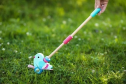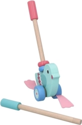 Ez a gyönyörű fa toló kacsa úgy lett kialakítva, hogy segítse a 12 hónapos kortól a gyermekek mozgási és egyensúlyi képességek fejlesztését. Az eltávolítható rúd, melynek hossza 48 cm, lehetővé teszi a játék könnyű tolását és kezelését. A teljes design egyesíti a türkiz testet és rózsaszín szárnyakat, ami ösztönzi a gyermekek képzeletét és színérzékét.