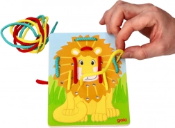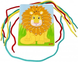 Élénk színű oroszlán lyukakkal a zsinórok könnyű befűzéséhez, amely hozzájárul a finommotorika fejlesztéséhez.