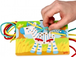 Színes fa zebra lyukakkal a zsinóroknak, ideális a kéz és szem koordináció tanulásához.