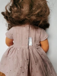 Aranyos muszlin ruha 38 cm-es babákhoz finom rózsaszín színben. Lengyelországban készült, kellemes tapintású, finom textúrájú anyagból. Könnyű karbantartás – alacsony hőfokon vasalható, ideálisan gőzzel frissíthető, hogy az anyag megőrizze a struktúráját. 3 éves kortól ajánlott és megfelel a CE szabványnak.