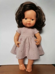 A karbantartás egyszerű – a muszlin jellegzetes textúrájának megőrzéséhez alacsony hőfokon történő vasalást vagy gőzöléssel való kisimítást javasolunk. A ruha ideális 38 cm magas babákhoz, és remekül illik a gyerekek játékvilágába.