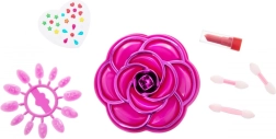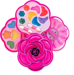 Aranyos mini sminkkészlet virág alakú dobozban, amely örömet szerez minden kezdő sminkesnek. Belül 3 szintnyi kozmetikumot talál: szemhéjpúdereket, rúzst, szájfényeket, valamint műkörmöket és matricákat – ideális a biztonságos, játékos sminkpróbálgatáshoz.