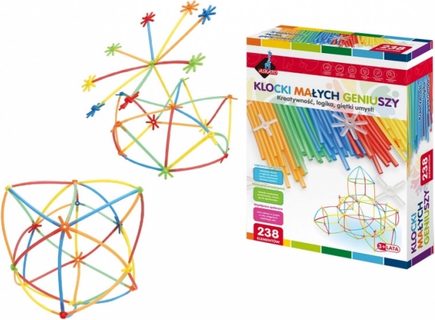 Kis Géniusz Kockák - Kis Szívószálak egy kreatív készlet kockákból szívószál formájában, amelyeket keresztes csatlakozókkal lehet különböző alakzatokká összekapcsolni. 238 különböző színű darabot tartalmaz, amelyek támogatják a kreativitást és szórakozást.