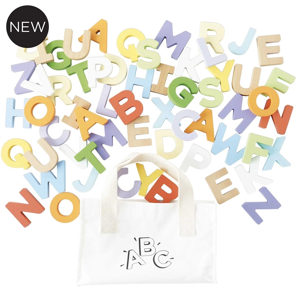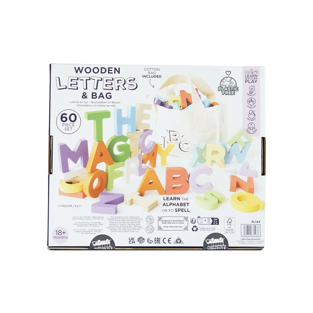 Le Toy Van alfabeto in legno in borsa di tela, 60 pezzi