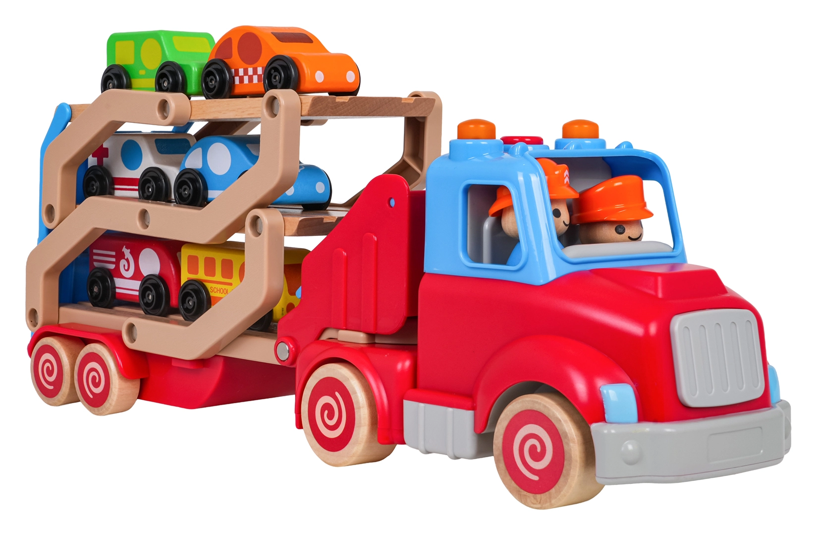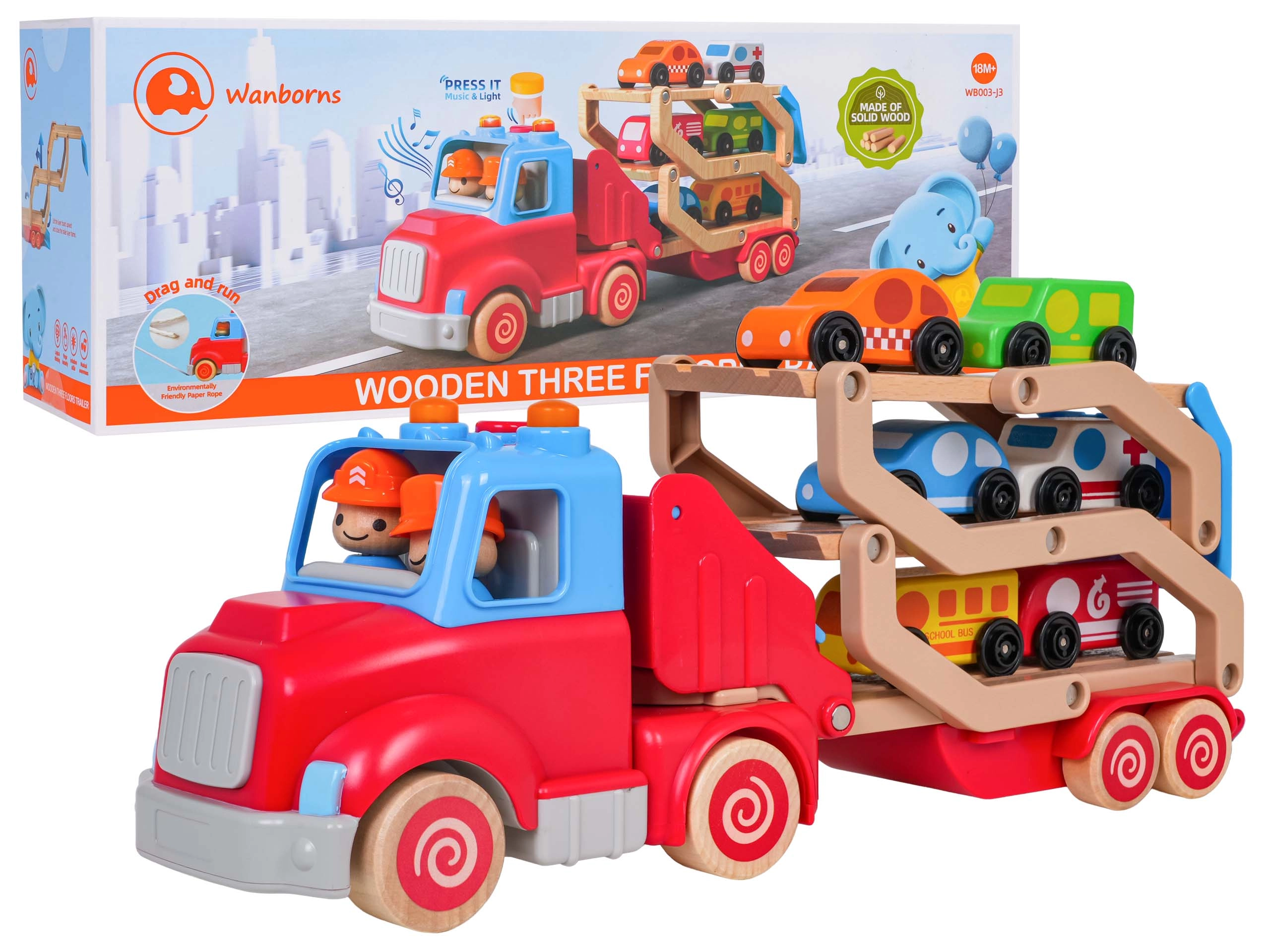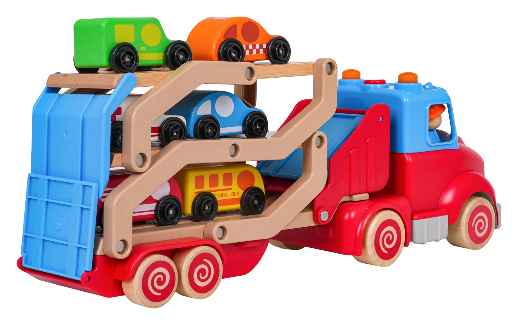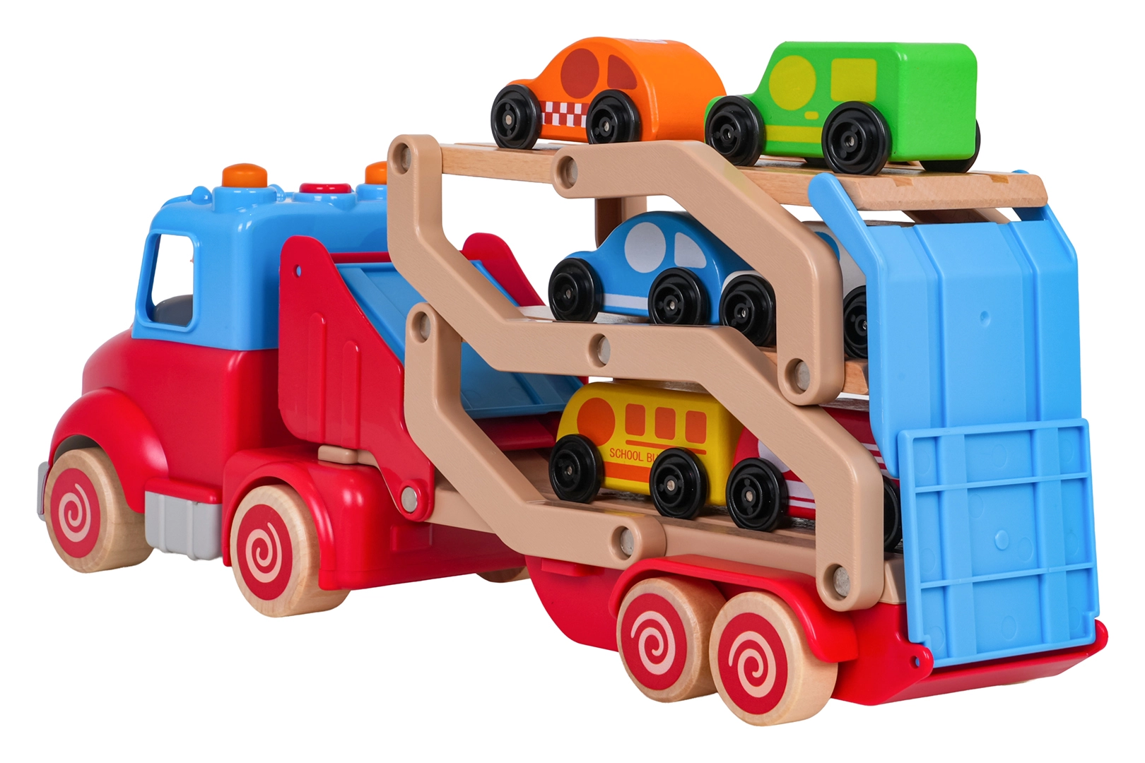 Carro attrezzi in legno con macchinine ed effetti luminosi e sonori