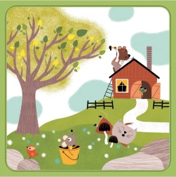 - tavola di gioco in legno, 20 carte illustrate, 5 gettoni con animaletti