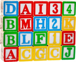 Il set contiene 20 blocchi di legno con lettere e immagini, che aiutano i bambini a imparare l'alfabeto e a sviluppare la creatività.