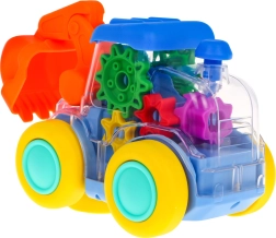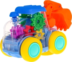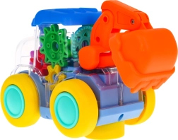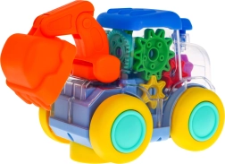 Questa colorata macchina da cantiere combina divertimento e apprendimento. La carrozzeria trasparente svela ingranaggi rotanti, che prendono vita durante la marcia e affascinano ogni piccolo costruttore. L'escavatore è alimentato a batterie e, grazie a un meccanismo intelligente, dopo l'urto con un ostacolo si gira e prosegue. L'atmosfera è assicurata da luci e melodie, mentre la benna mobile invita a nuovi scenari di gioco.