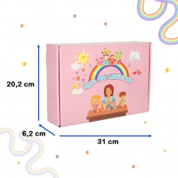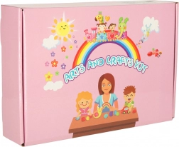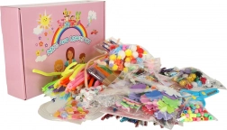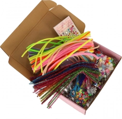 Il contenuto della confezione include, tra l’altro: filati cinigliati normali e glitter, spatole di legno, foglietti colorati, set di adesivi, occhi mobili e colorati, pompon, piumette, perline inclusi caratteri alfabetici, cordoncino in plastica per infilare e forbici di sicurezza. Il tutto è riposto in una elegante scatola rosa, perfetta anche come regalo.