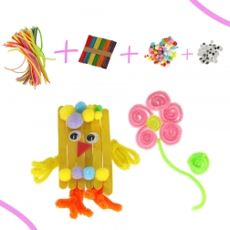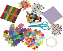 Set completo di materiali, dai filati cinigliati e pompon agli adesivi e alle perline, per consentire ai bambini di realizzare progetti vari senza dover acquistare altri accessori.