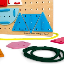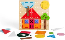 Nella confezione trovi una robusta base in legno, 44 forme colorate e 6 lacci resistenti per l’infilatura. Il giocattolo è realizzato con materiali provenienti da fonti responsabili e rispetta tutte le norme di sicurezza europee, così puoi contare su un gioco sicuro già dai 3 anni.