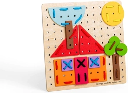 Infilare i lacci attraverso i fori della base e dei pezzi rafforza le dita, allena la coordinazione occhio–mano e migliora la concentrazione. Attività ideale per i bambini in età prescolare.