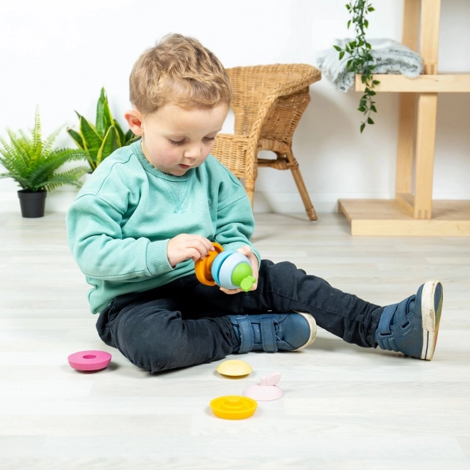 Impilare e ordinare i pezzi sviluppa la presa, la coordinazione mano–occhio e la concentrazione. Attività ideale per bambini da 1 anno.