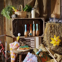 - Set completo: 6 birilli + 2 palle in legno per giocare subito