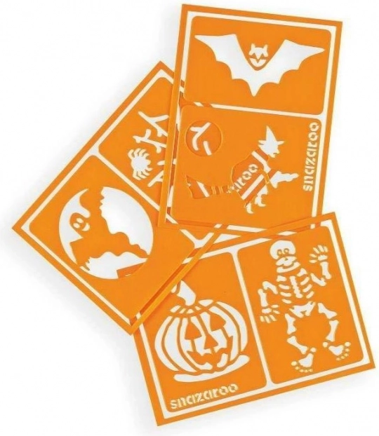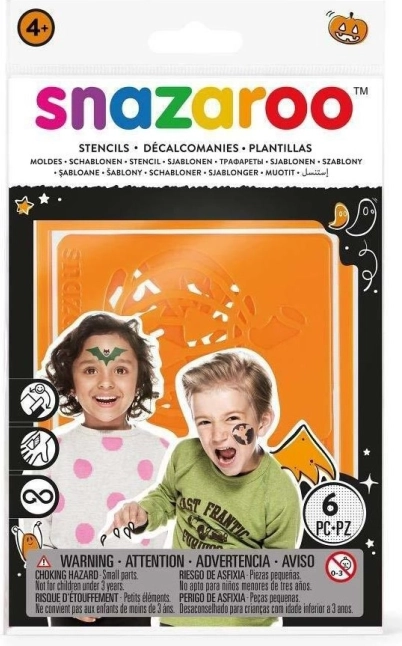 Set di sei stencil SNAZAROO per un trucco viso e corpo facile e veloce. Motivi a tema Halloween, supporto autoadesivo per stabilità, materiale flessibile per aderire alle curve e riutilizzo grazie alla finitura lavabile.