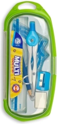 - Contenuto del set: compasso in metallo, righello 15 cm, 2× triangolo, goniometro, matita, temperino, gomma